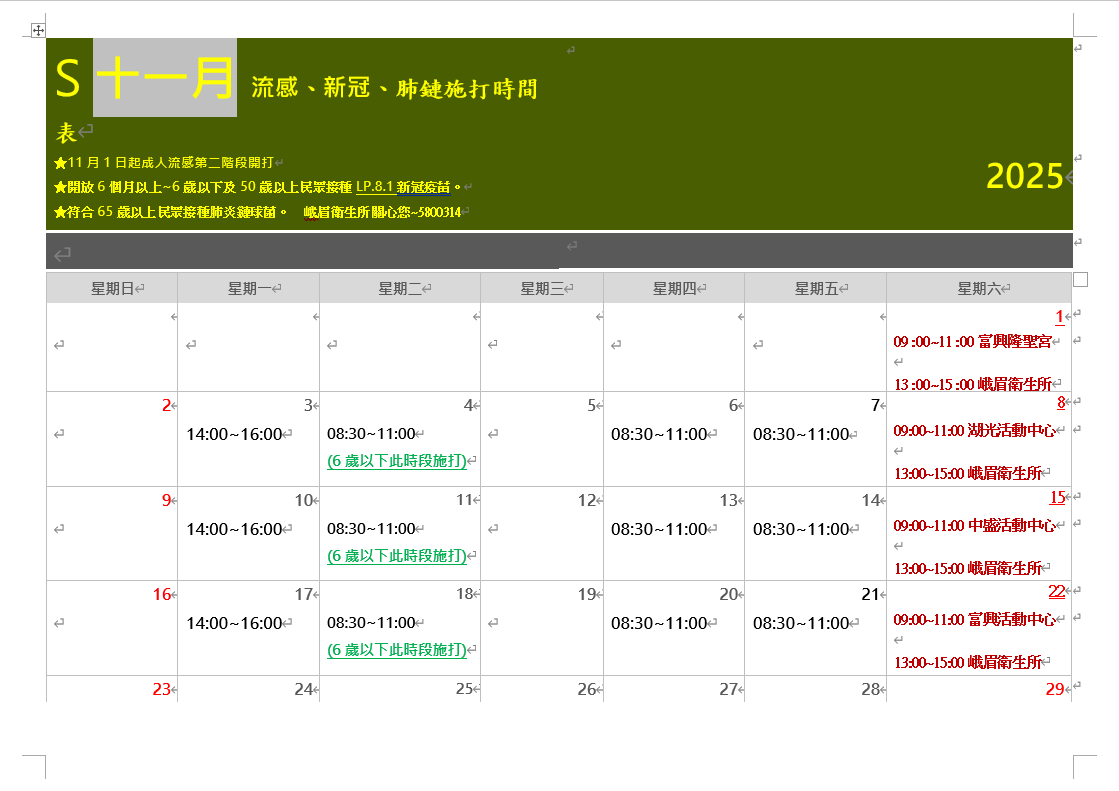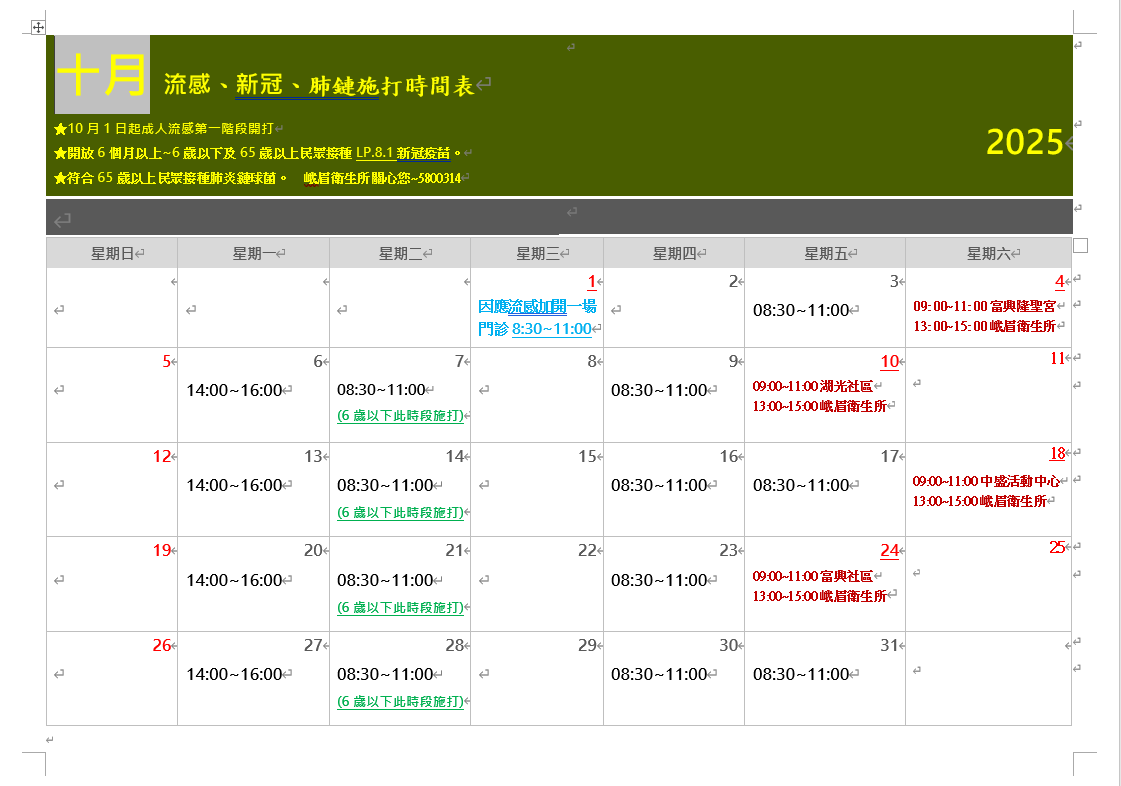 114年10月1日公費流感,新冠疫苗開打~ 左流右新~健康安心 10月1日起符合第一階段公費資格者請盡早完成接種~ 11月1日起第二階段公費對象開打(50歲以上民眾)~ 衛生所除了門診時間提供施打,還加開假日場次供民眾利用~ 除了流感,新冠疫苗外,還提供公費肺炎鏈球菌疫苗施打~ 符合公費資格者前來施打請記得攜帶健保卡~ 幼兒施打請利用小兒預注時間: 每周二08:30-11:00 (請攜帶兒童健康手冊+健保卡) 歡迎民眾多加利用或來電詢問:03-5800314 ~峨眉衛生所關心您~