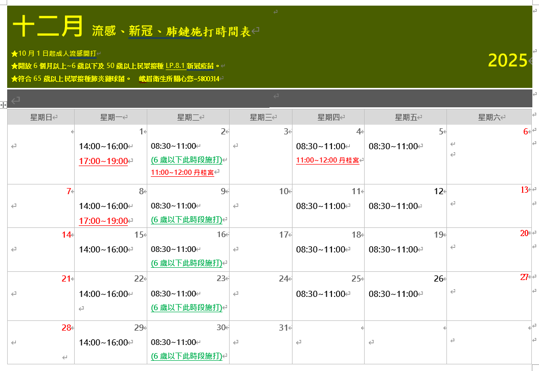 以及早獲得免疫保護力,12月仍持續加開流感及新冠疫苗場次,請鄉親