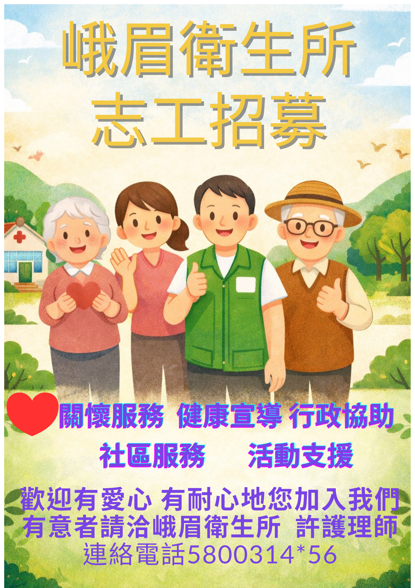 峨眉鄉衛生所誠摯邀請關心社區健康、樂於服務的您,加入我們的志工行列。 透過志工服務,一起協助健康宣導、活動支援與民眾關懷,為鄉親打造更健康、友善的生活環境。 無論是否具備醫療背景,只要您有熱忱、有時間、有一顆願意付出的心,都非常歡迎加入我們,與我們一同守護社區健康。
